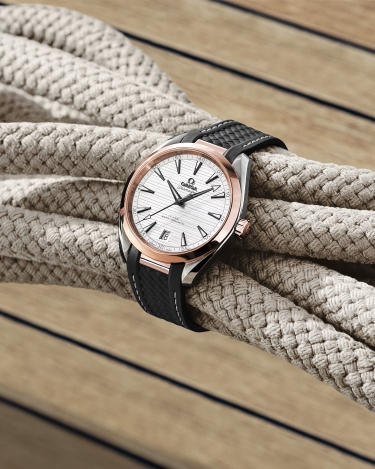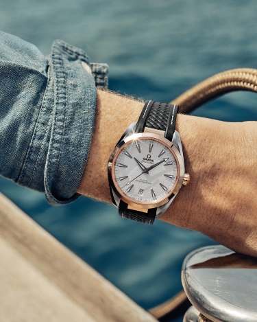 The silvery dial is distinguished by a horizontal “teak” pattern which is inspired by