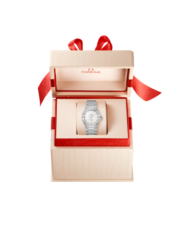 The hands, OMEGA logo, Constellation star and diamond holders are in 18K white gold.