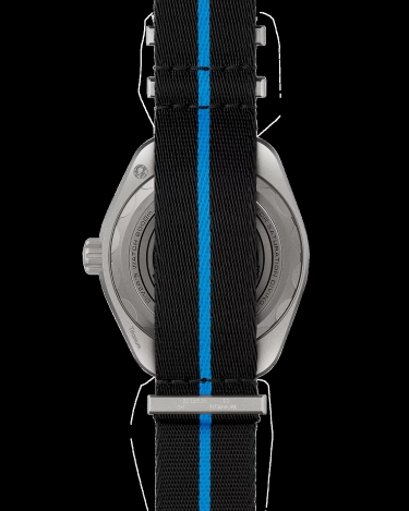 on to a striped black and cyan polyamide NATO strap with a loop and buckle in