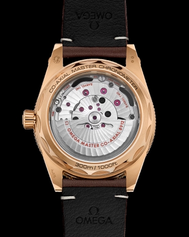 a transparent sapphire crystal caseback, enabling a clear view of the OMEGA Co-Axial