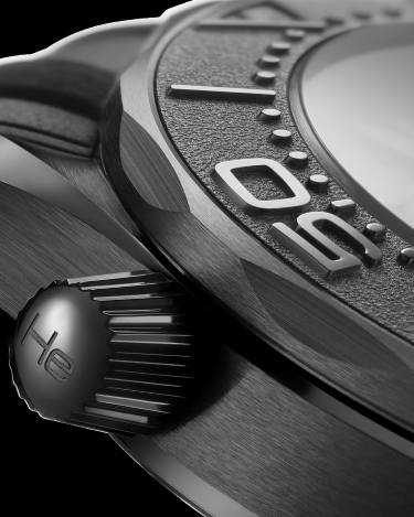 dial, crown and helium escape valve, all in the same striking material, give the watch a